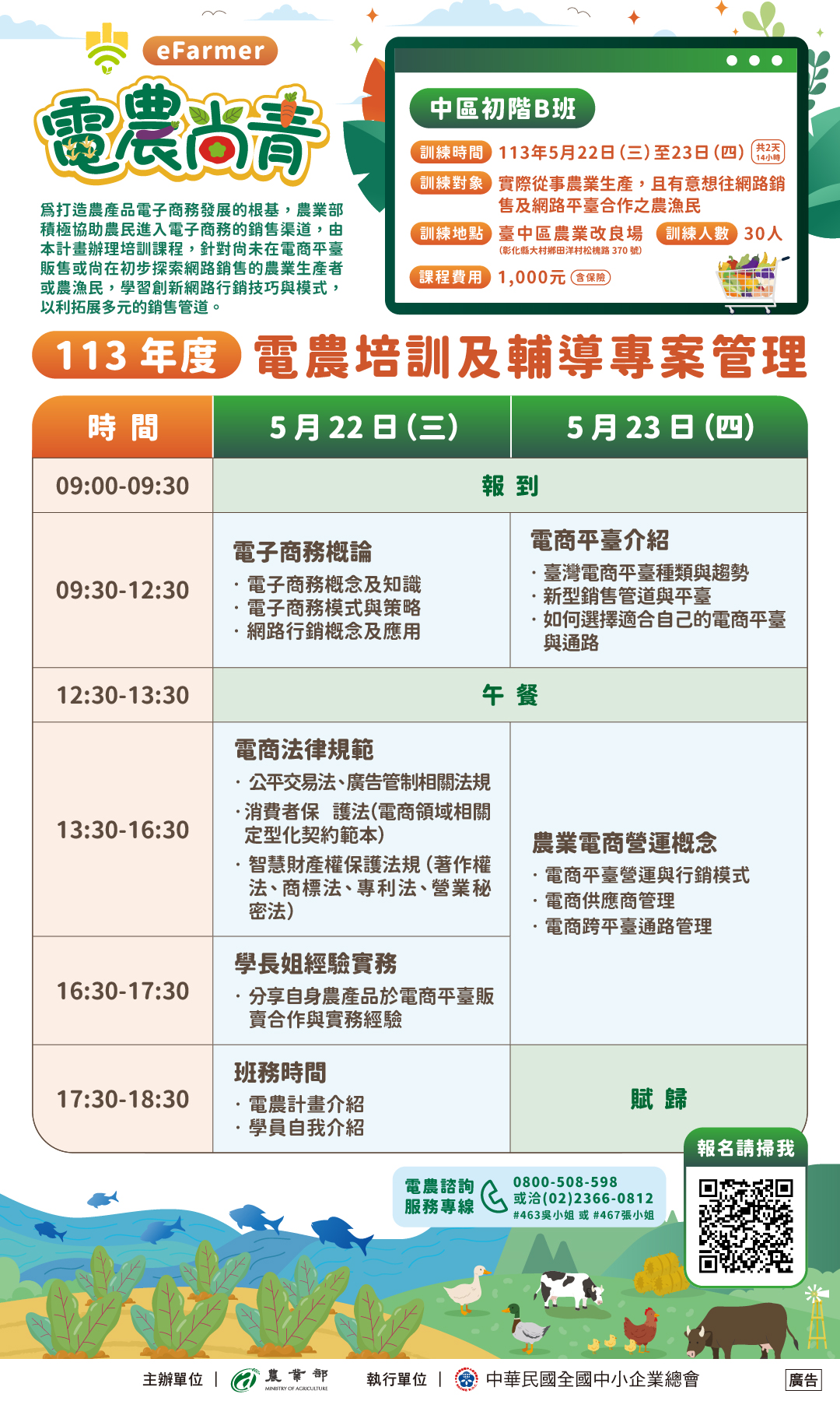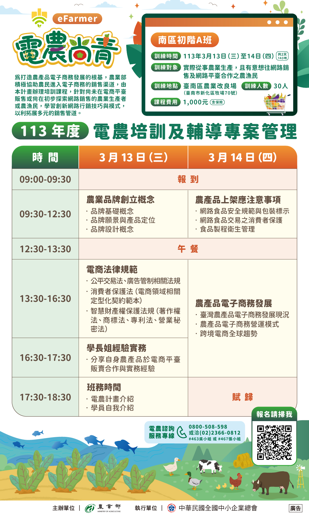 為打造農民對於農產品電子商務的發展根基,農業部特委託本會辦理旨揭培訓課程。 社團法人中華民國全國中小企業總會將於全國各地區舉辦電農培訓專班,旨揭課程擬於113年3月13日(三)至14日(四)、20日(三)至21日(四)及5月8日(三)至9日(四)、22日(三)至23日(四)辦理,以強化學員有關電子商務基本知能,並積極協助進入電子商務銷售渠道,惠請貴會協助推廣及邀請農民參加。