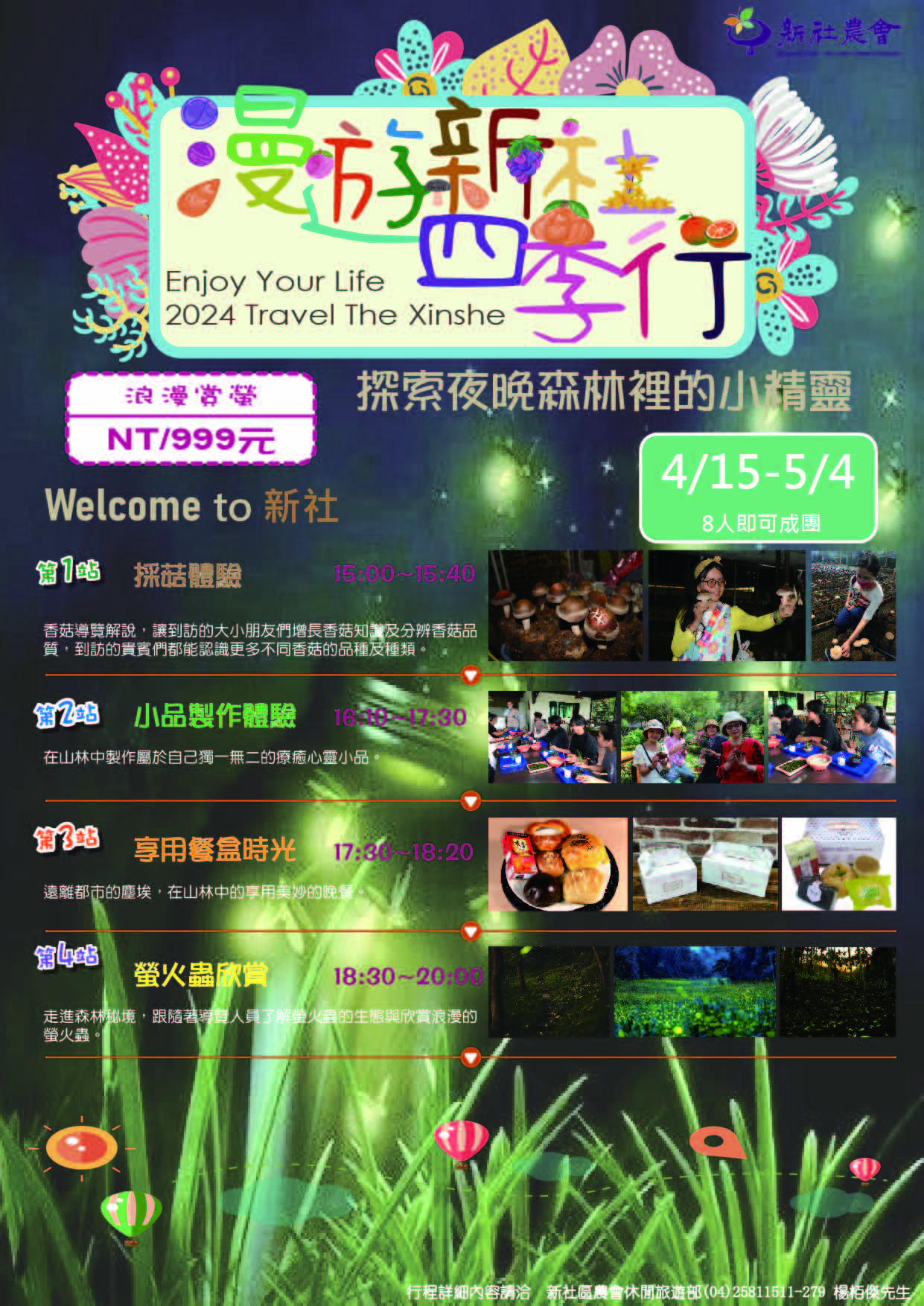 活動詳情請參閱活動DM,機關團體報名請洽「新社區農會旅遊部」,報名專線:04-25810868,楊?傑先生。