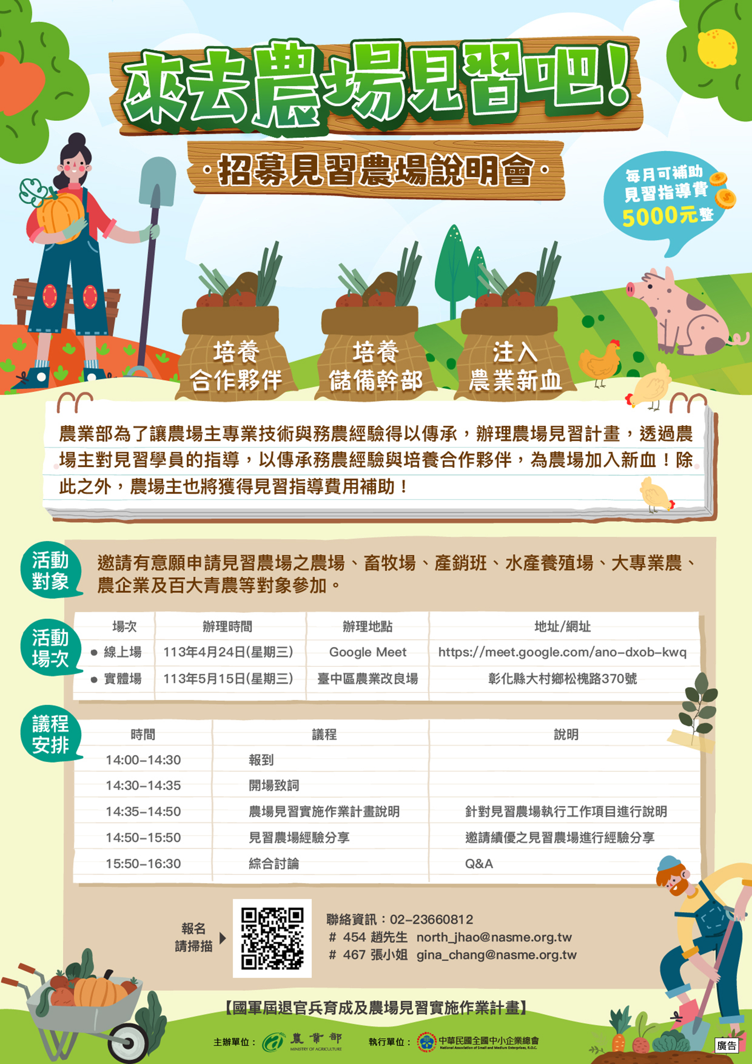 農業將於113年4月24日(線上場)及5月15日(中部場)各辦理1場次招募見習農場說明會,說明見習農場實施作業計畫與提供見習農場經驗分享,並協助有意願之農場、畜牧場、產銷班、水產養殖場、大專業農、農企業及百大青農等申請成為見習農場。