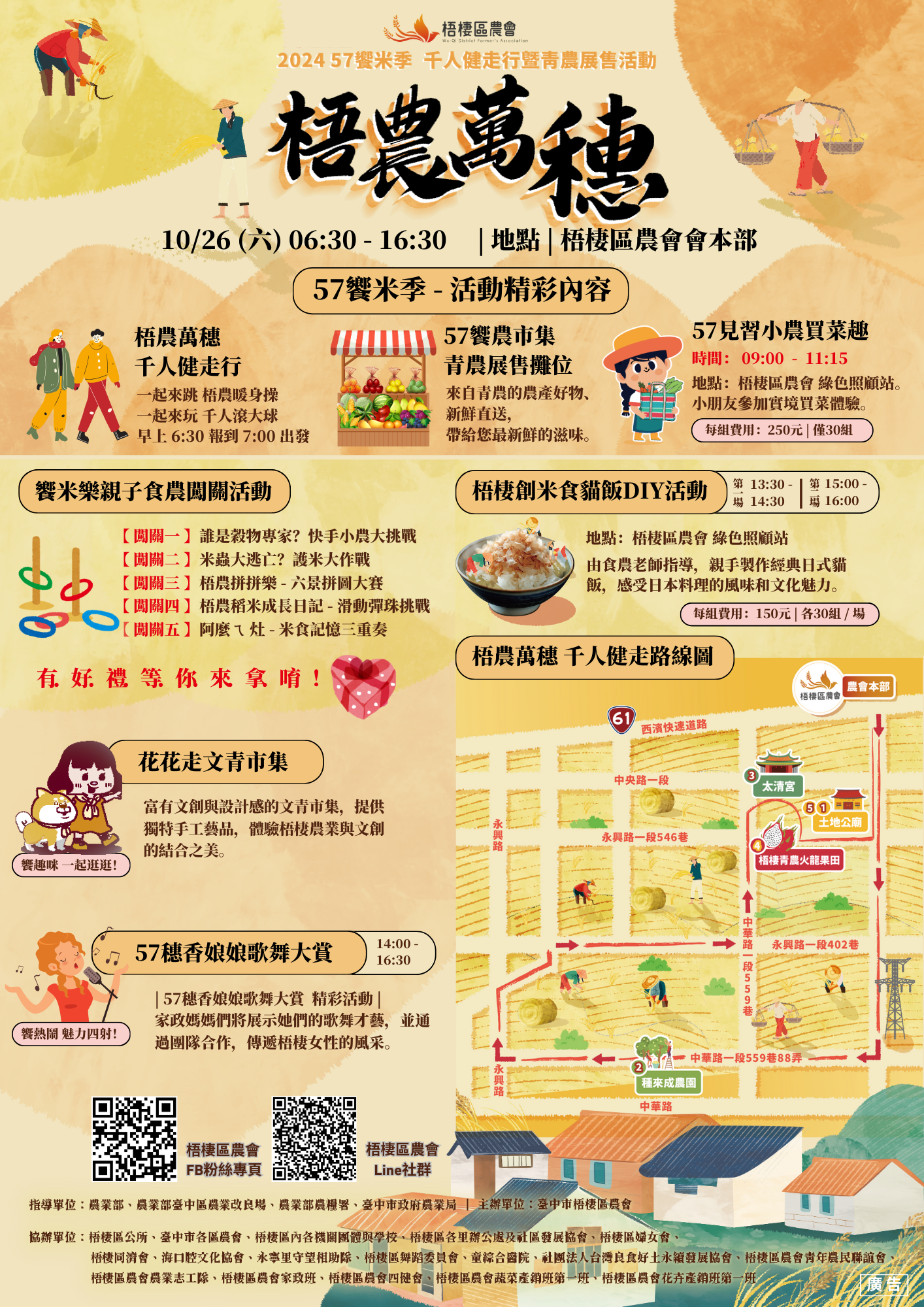 活動日期:113年10月26日(星期六)。 活動時間:08:30~16:30。 活動地點:梧棲區農會 會本部(臺中市梧棲區港埠路一段545號)。 活動內容:57饗米千人健走行、57饗農市集青農展售攤位、57家政媽媽饗米聚、57見習小農買菜趣、饗米樂親子食農闖關活動、梧棲創米食貓飯DIY活動(2場次)、穗香娘 娘歌舞大賞 家政班交流活動、推廣三部門成果展、57烘焙俱樂部米糧加工製品,創新行銷成果展、大家作伙來-種樹分送樹苗活動。