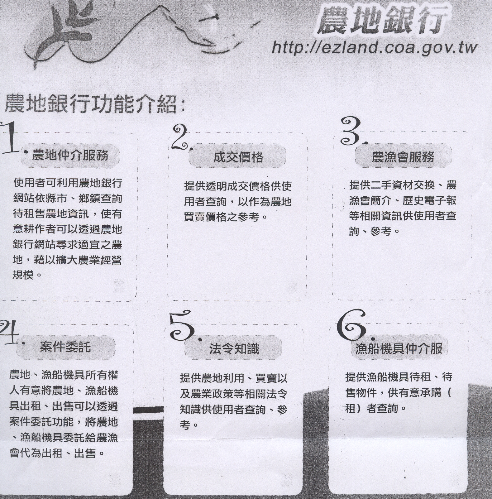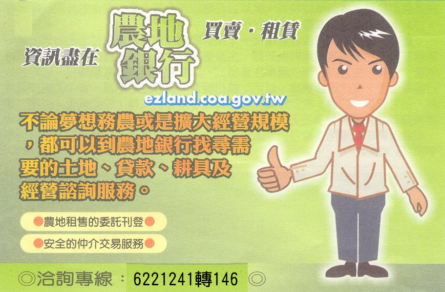 行政院農業委員會為促進農地流通及有效利用,正輔導農會辦理農業用地買賣、租賃、委託經營 之仲介業務,簡稱 農地銀行 ,本會辦理農業用地買賣、租賃、委託經營之仲介業務係屬強化對農民服 務之新興任務,本會己於 96 年 10 月 5 日第 15 屆第 17 次理事會提案送理事會審議通過,均可辦理,歡 迎農民有意願者,請洽詢信用部放款人員,均會有專人處理。