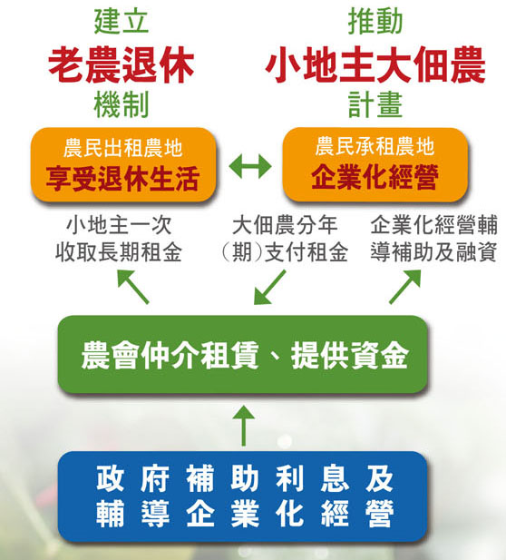 為讓老農安心退休,並促使農地流通及活化農地利用,協助年輕農民擴大農場經營規模,「小地 主大佃農」政策,是以政府提供「一次付租,分期償還」的租金長期無息貸款機制,讓老農能一次或 分次拿到一筆租金,享受退休生活。年輕農民可以分年償還租金方式,降低擴大農業經營面積成本, 提高整體農業生產效益與競爭力。