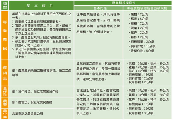 - 經營條件:以輔導擴大農地模模、經營企業化及提高競爭力之農糧、畜牧或農牧綜合經營。